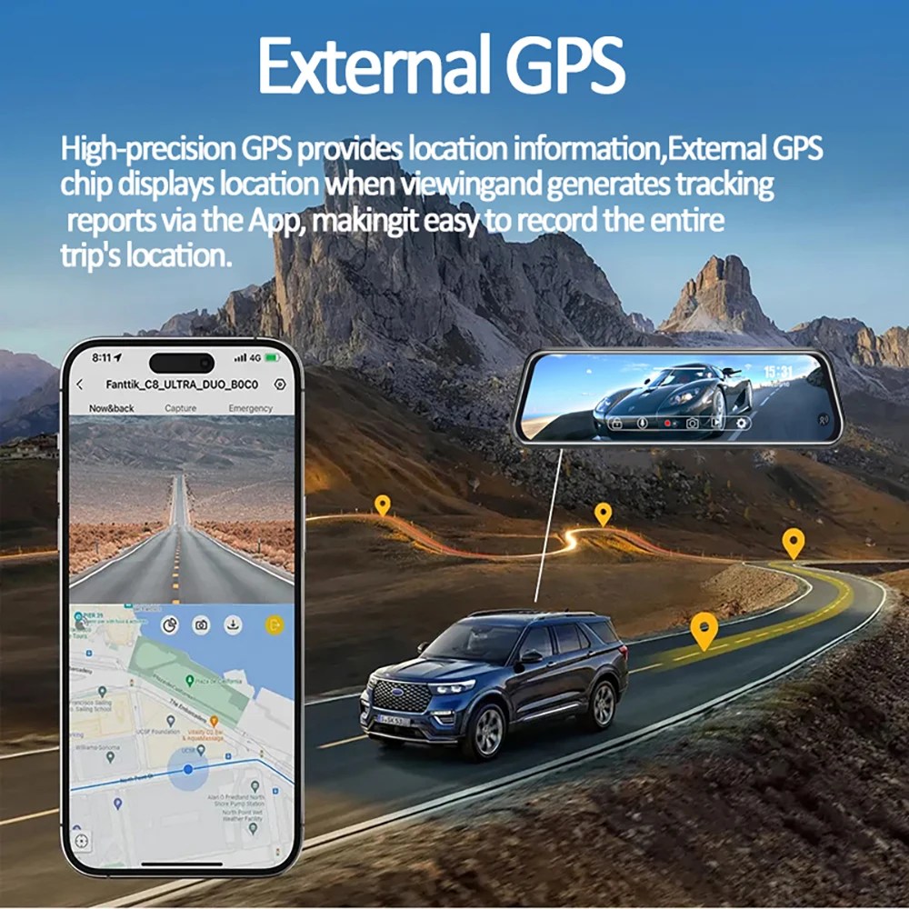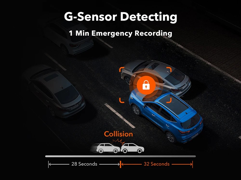 - G-Sensor: Automatically saves footage during sudden impacts.